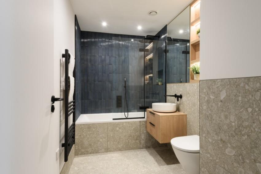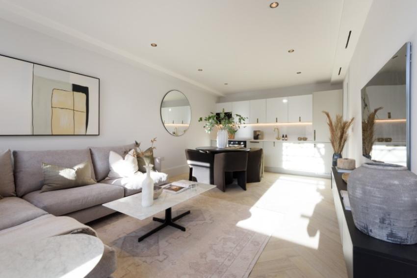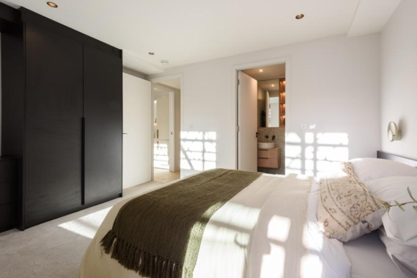 The interiors feature open-plan living spaces with bespoke kitchens, stone worktops and Bosch integrated appliances, complemented by Herringbone flooring. High ceilings and large windows create a bright and airy atmosphere, while the bedrooms are complete with bespoke fitted wardrobes featuring integrated lighting. Contemporary bathrooms combine elegant design with premium materials to create a space of true comfort and style.