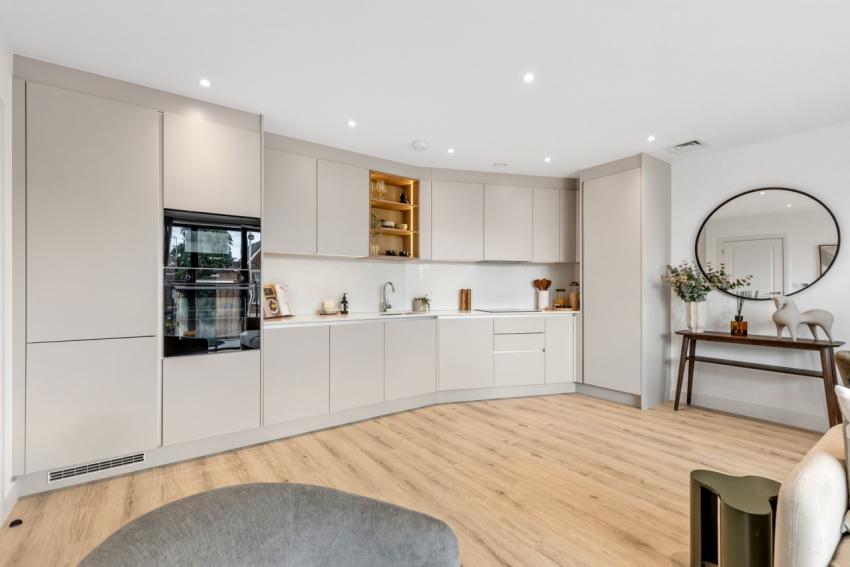 • Modern handleless cashmere grey kitchens with brushed stainless steel handless profiles. Solid 18mm white carara engineered stone worktop and splashback. Open unit shelving in sand oak with integrated lighting. Lighting under wall cabinets. Warm lights integrated in handless profile under wall units. Stainless steel undermount sink and tap. Bosch appliances include electric hob, integrated extractor, built-in oven, microwave, dishwasher, full height fridge freezer.