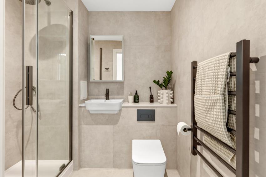 • Fully tiled bathrooms with Spanish tiles. Wall mounted Gunmetal shower head. Mirror vanity unit with storage, LED and shaver socket. Fixtures in Gunmetal include hand held shower, bath/shower screens, sink mounted taps, towel radiator.